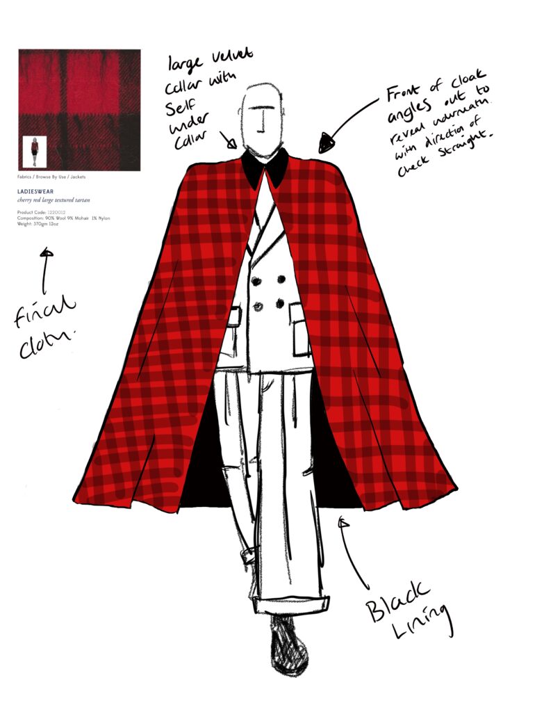 Full design: double-breasted coat with sharply cut peak lapels and softer patch pockets, with wide legged, turned-up trousers, topped with a baker boy cap and worn with a full cape, all made in the same stunning cloth from Holland & Sherry.