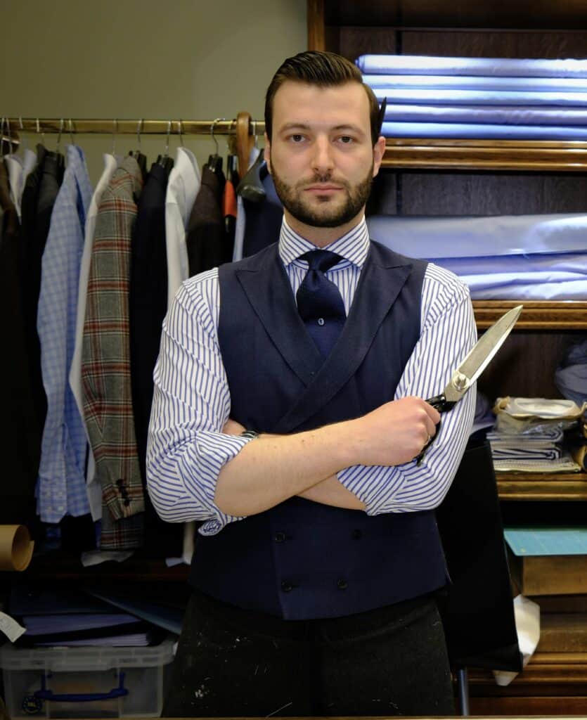 Alex joined the company in 2013, originally training as a coat maker. Eager to learn more of the craft he was invited to join the bespoke cutting team by now Creative Director Nicholas De'Ath and now looks after his own customers as an integral part of the bespoke cutting team.
