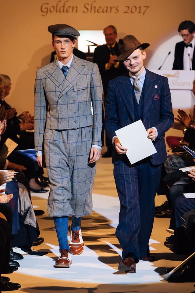 Alex Hills' Golden Shears Finalist outfit is currently on display in the shop window at Number 10 Savile Row, as part of 50 Years of Golden Shears, during London Fashion Week.