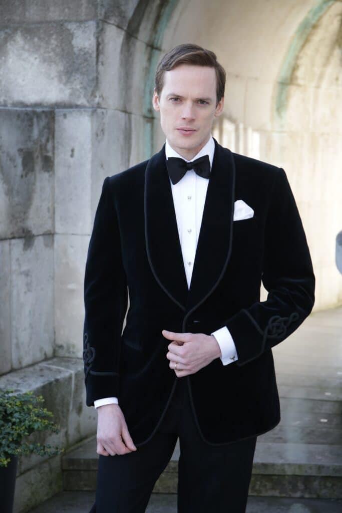 The double-breasted suit modelled here is made from one of the four unique basket weave cloths woven in Yorkshire to mark the 160th anniversary of our bespoke tailoring house and shirt-makers, established in 1865.