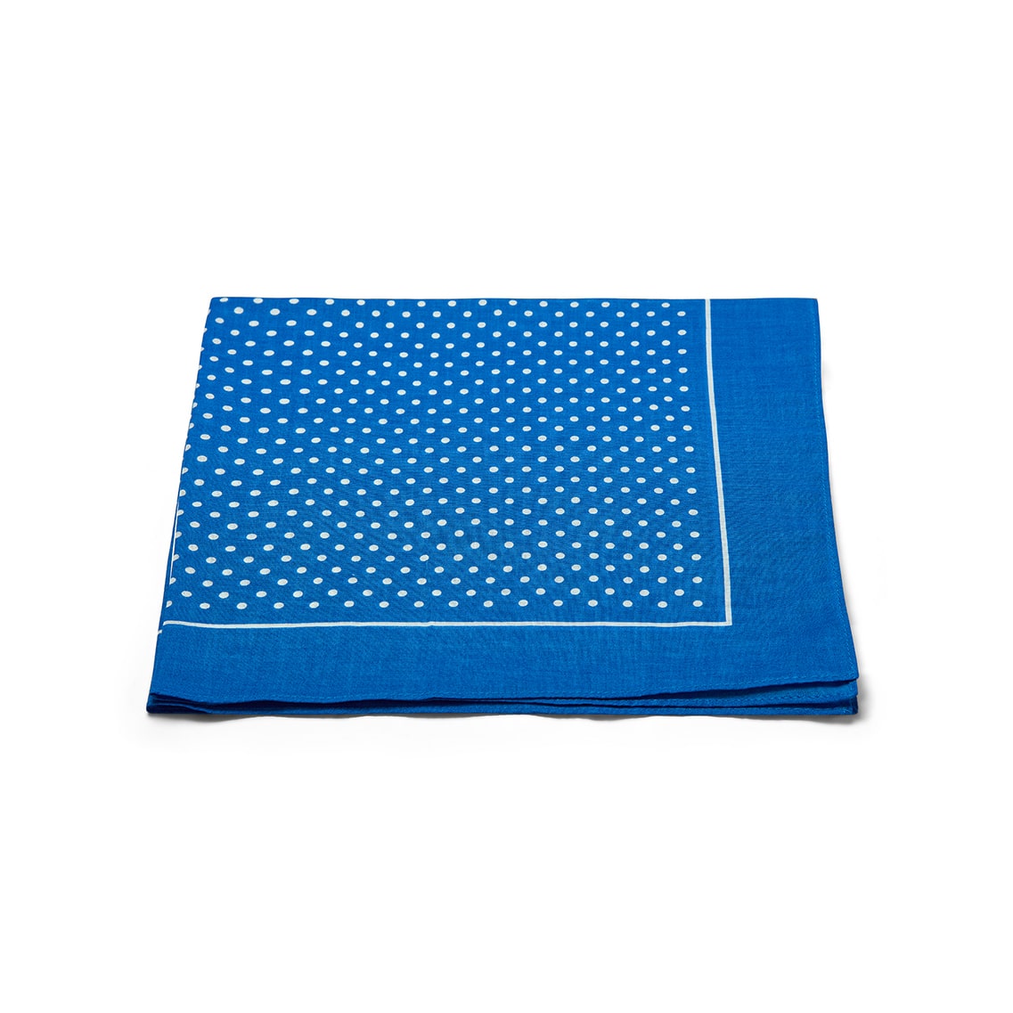 Bright blue 100% cotton handkerchief with white polka dots and hand-rolled edges.