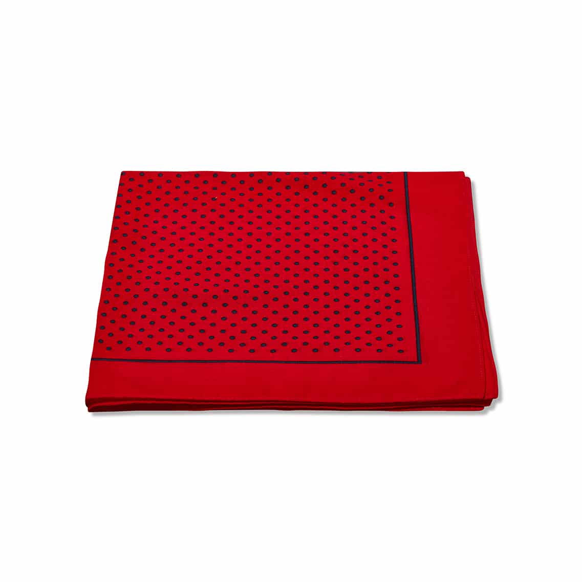 Red 100% cotton handkerchief with navy polka dots and hand-rolled edges.
