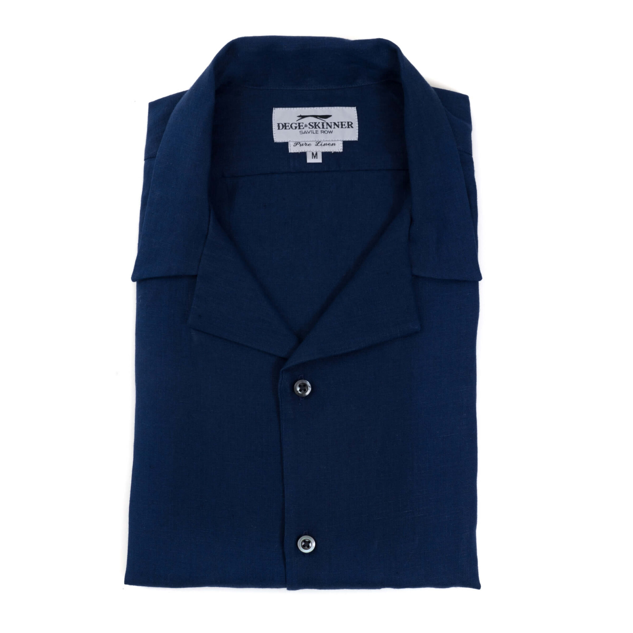Navy blue linen short-sleeve shirt with a camp collar in a relaxed summer fit, perfect for warmer climates.