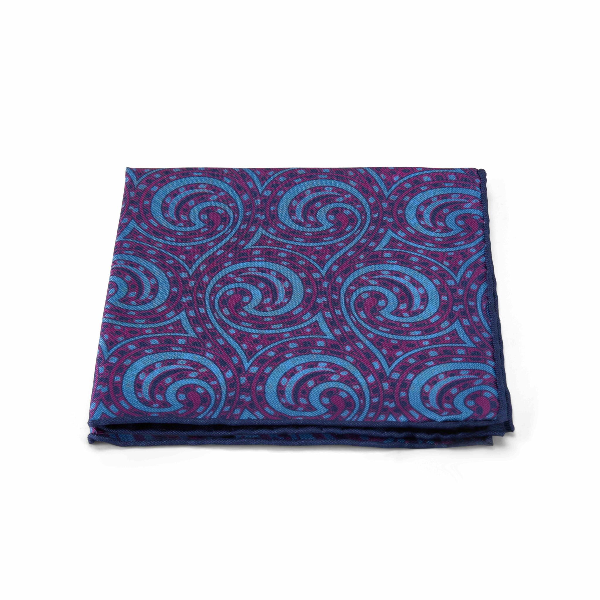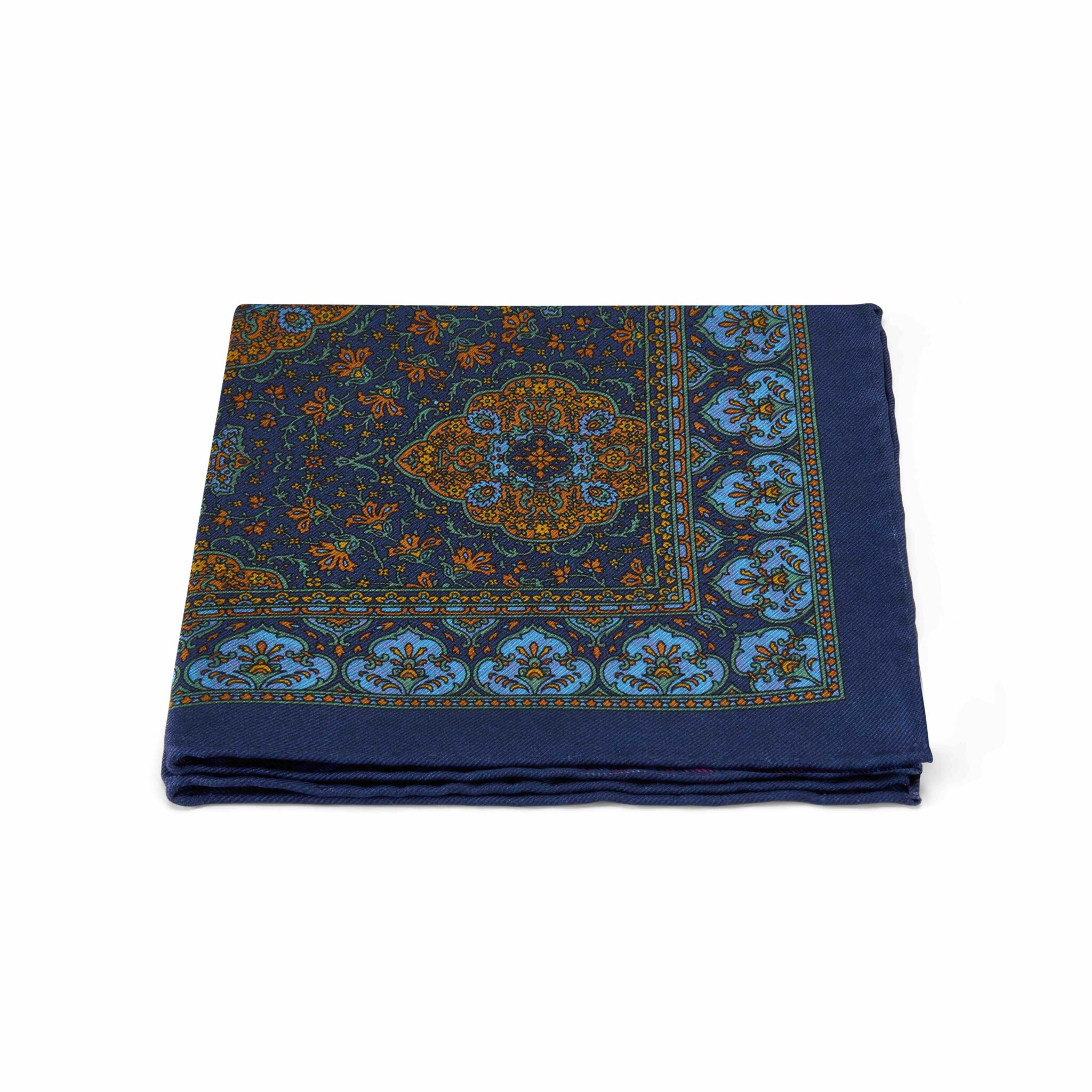 Navy blue and orange Moorish rug reversible swirl pure silk pocket square with hand-rolled edges.