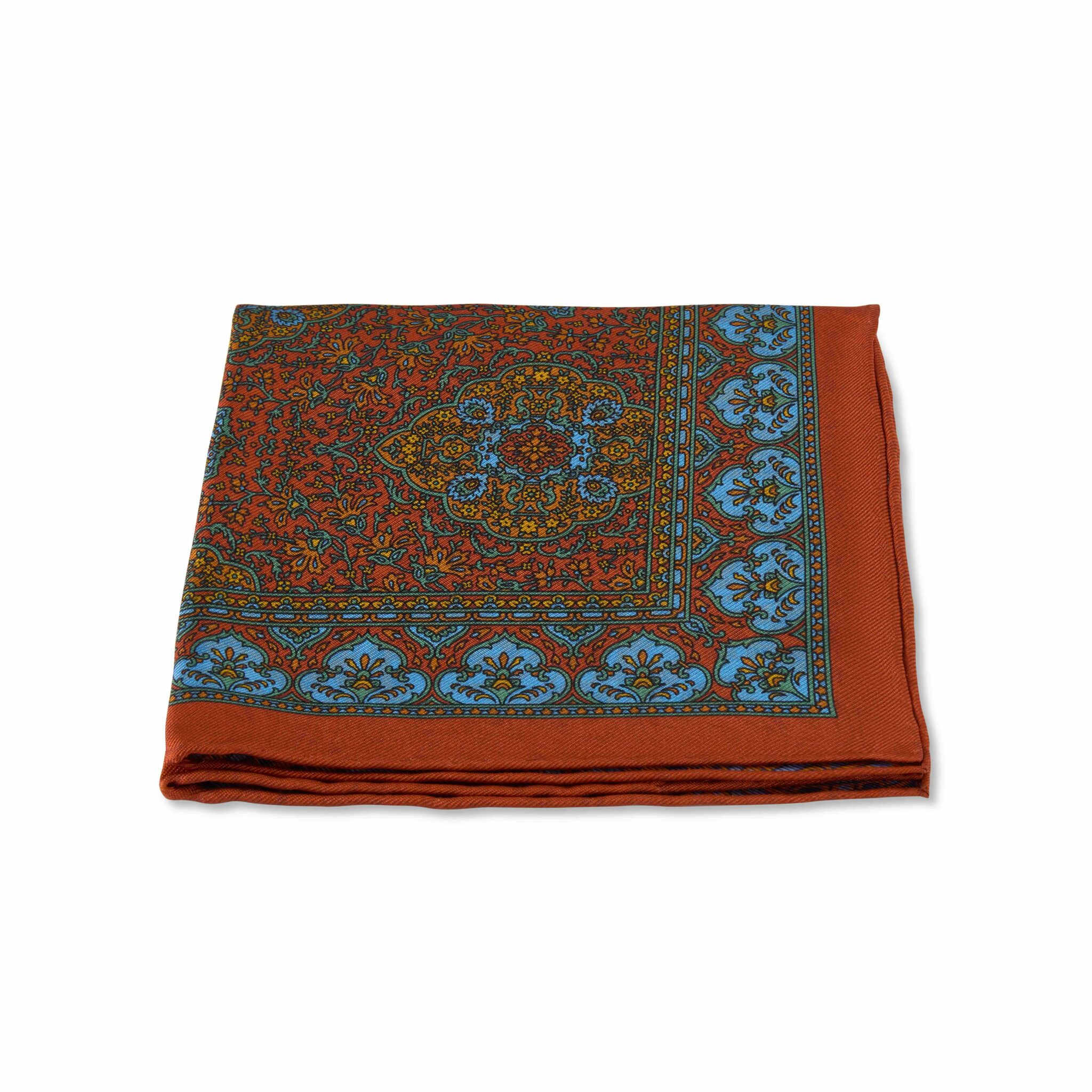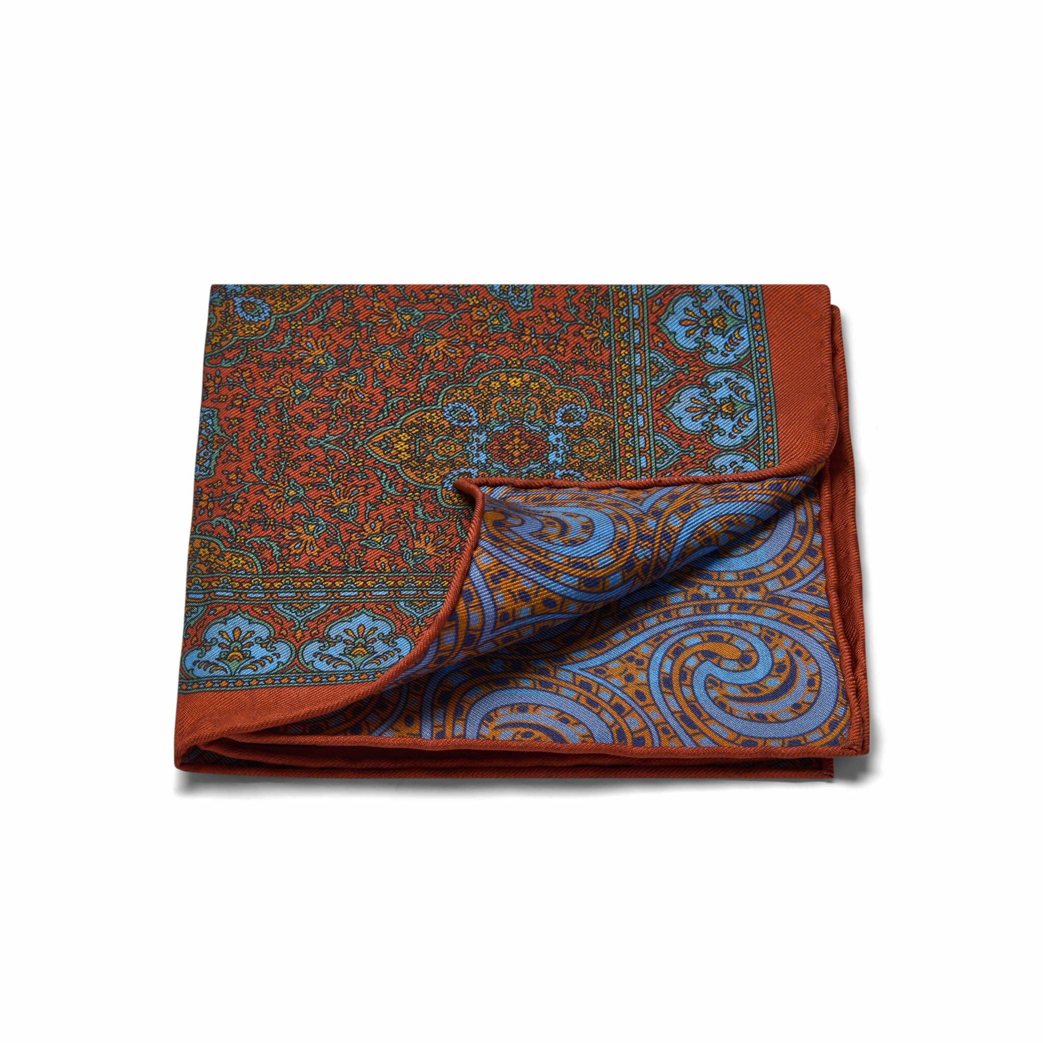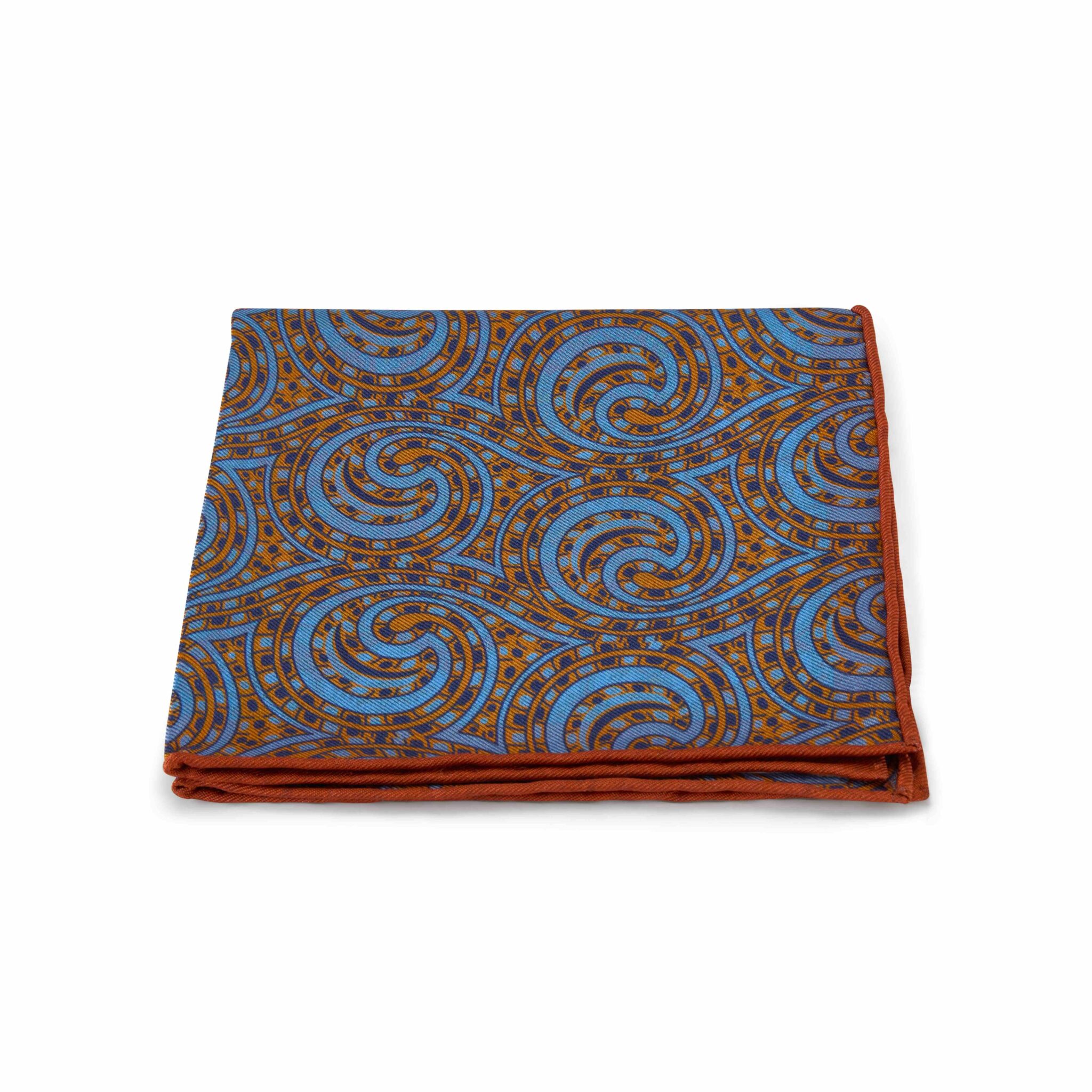 Orange, yellow and blue Moorish rug reversible swirl pure silk pocket square with hand-rolled edges.