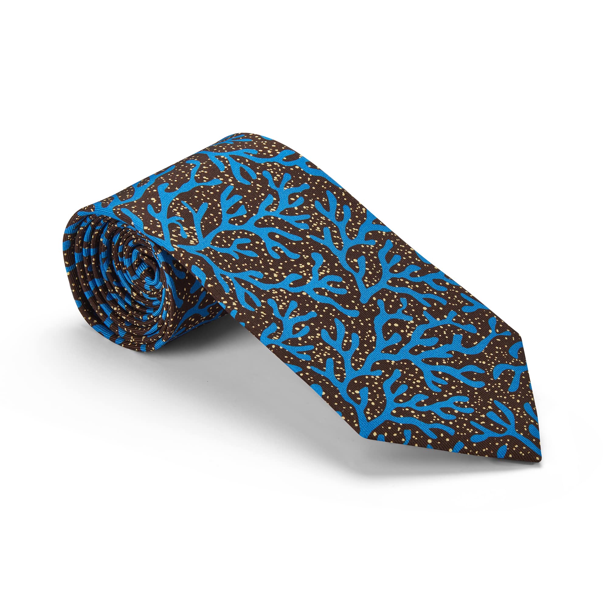 Pure silk tie printed with brown and mid-blue seaweed motif.