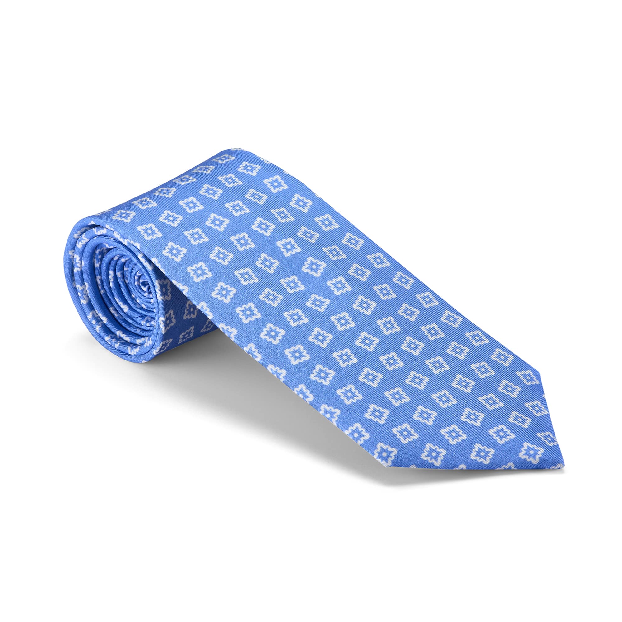 Light blue printed silk tie with white squares.