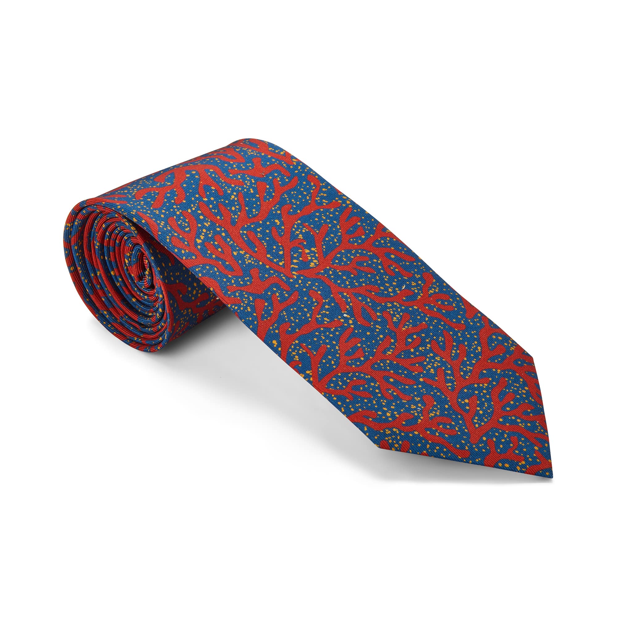 Pure silk tie printed with mid-blue and red seaweed motif.