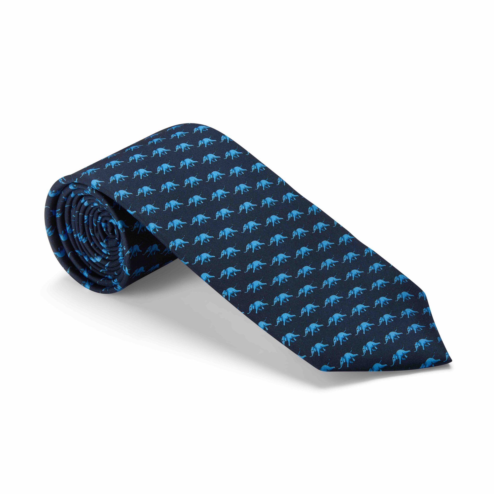 Navy blue pure silk tie printed with light-blue elephants.