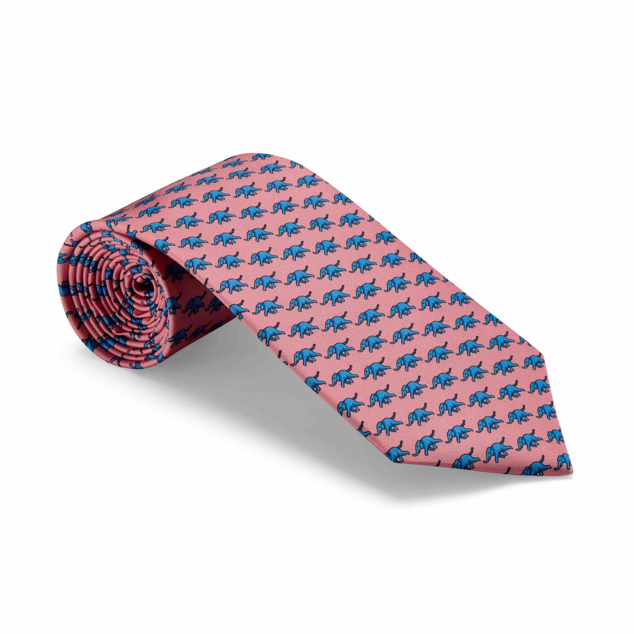 Pink pure silk tie printed with light-blue elephants.