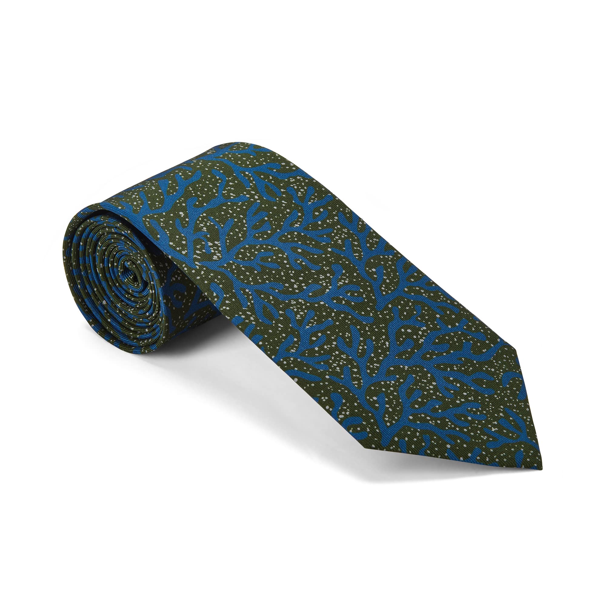 Pure silk tie printed with olive green and mid-blue seaweed motif.