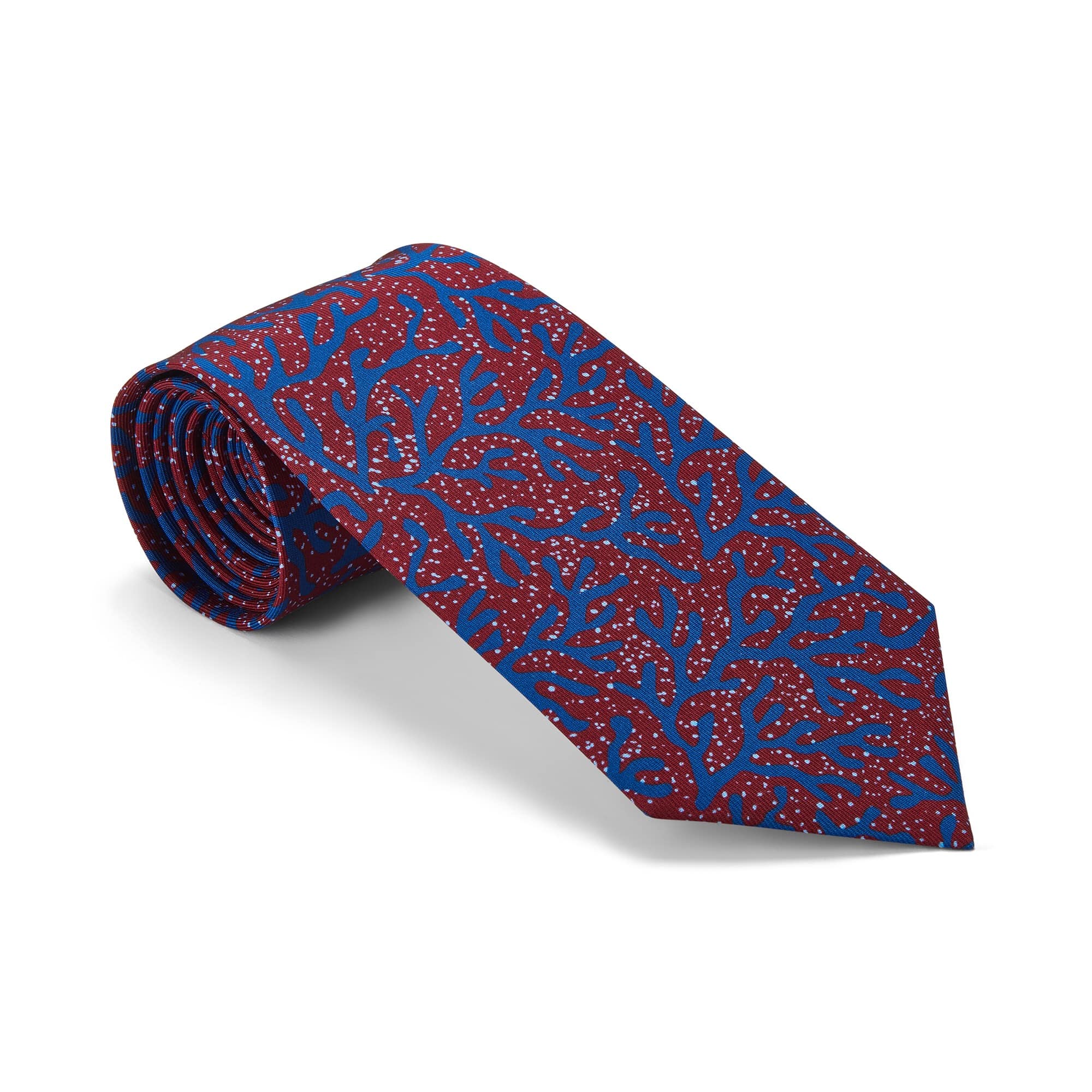 Pure silk tie printed with wine and royal blue seaweed motif.