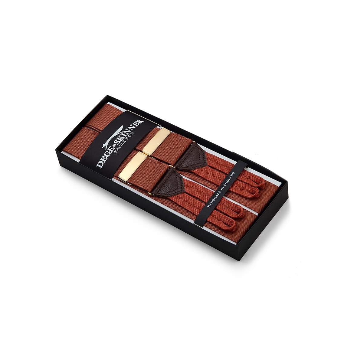 Dark salmon pink barathea silk braces, with handcrafted matching coloured leather ends and gilt fixings.