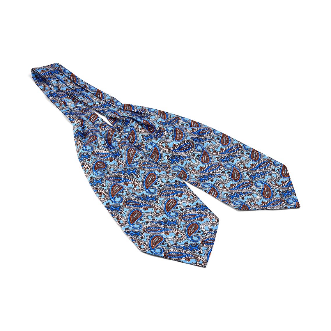 Light blue, royal blue and brown large paisley silk cravat.