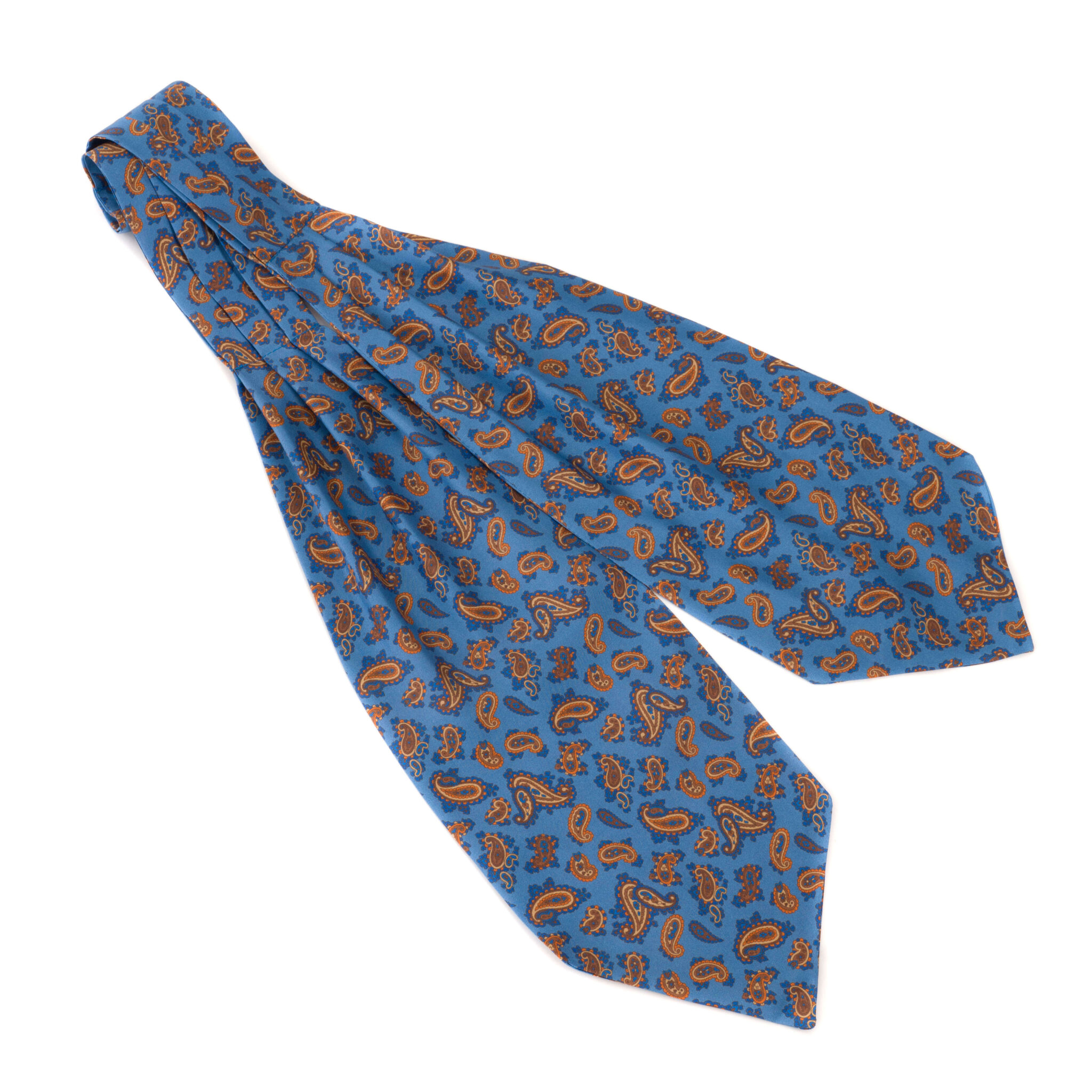 Ocean blue printed silk cravat with tan paisley design.