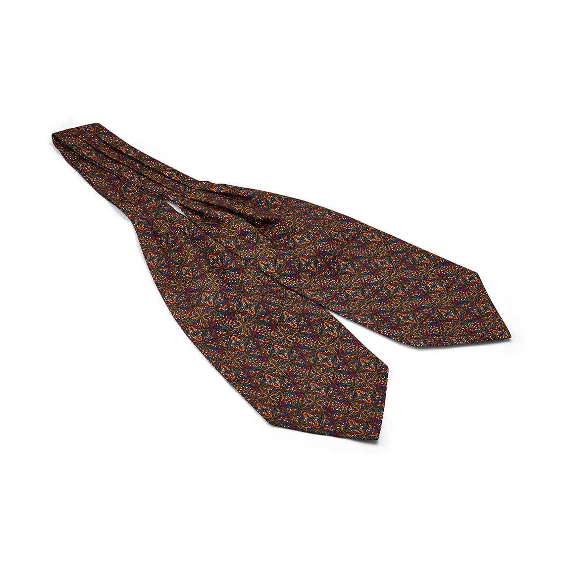 Orange, green and blue pugin tile silk cravat.