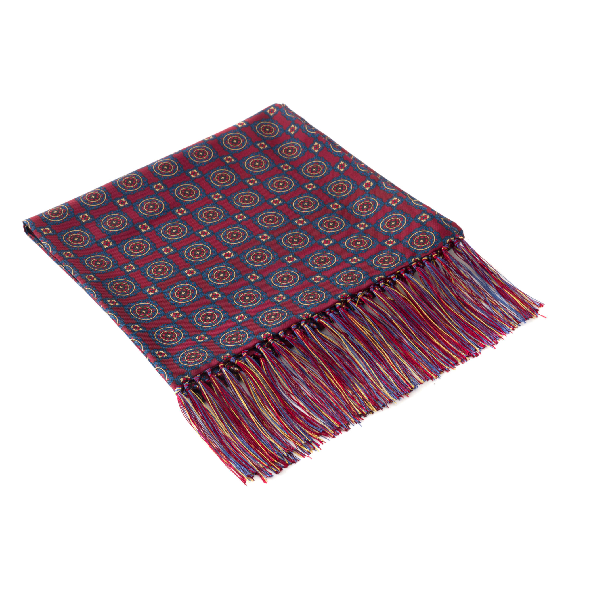 Burgundy coloured silk madder fringed scarf with blue, red and yellow asymmetric design.