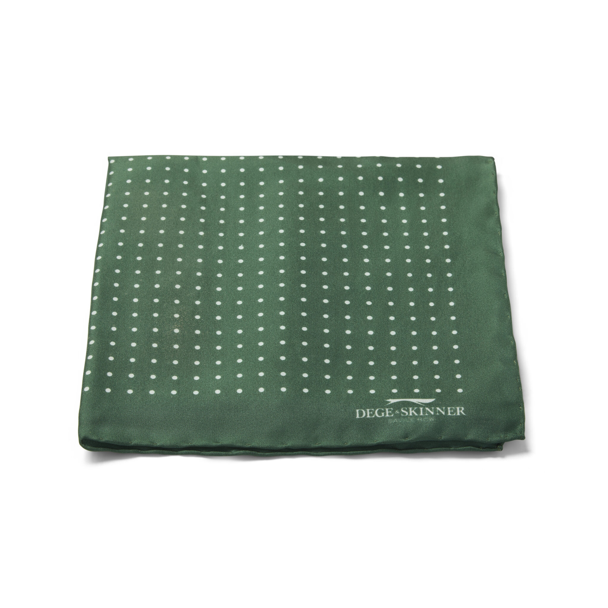 Emerald green pure silk pocket square with small white polka dots.