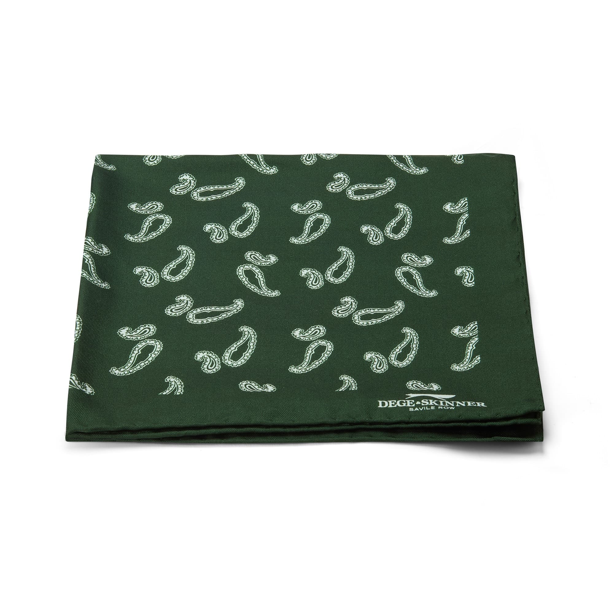 Pure silk pocket square in green paisley, with hand-rolled edging.