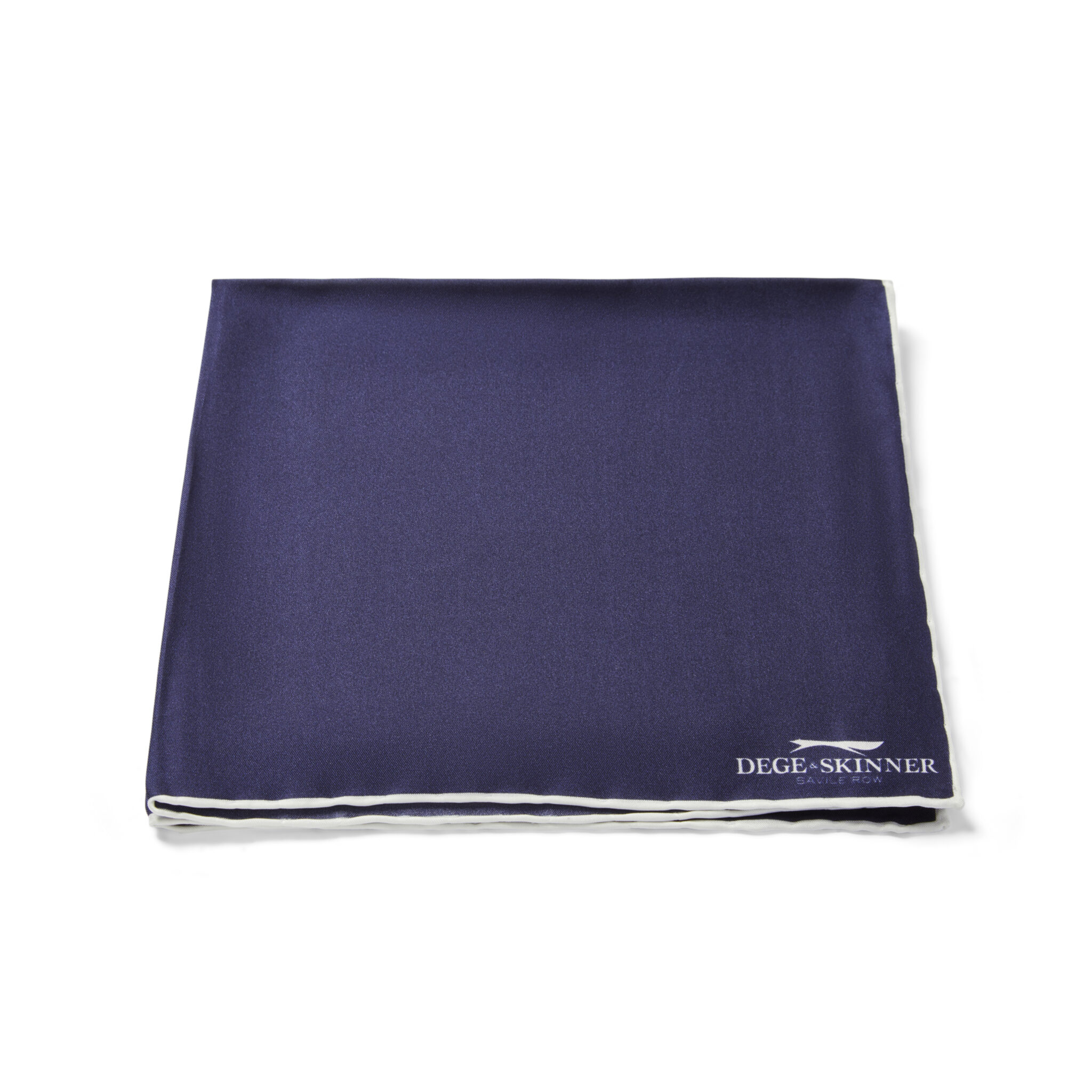 Navy blue pure silk pocket square with white hand-rolled edging.