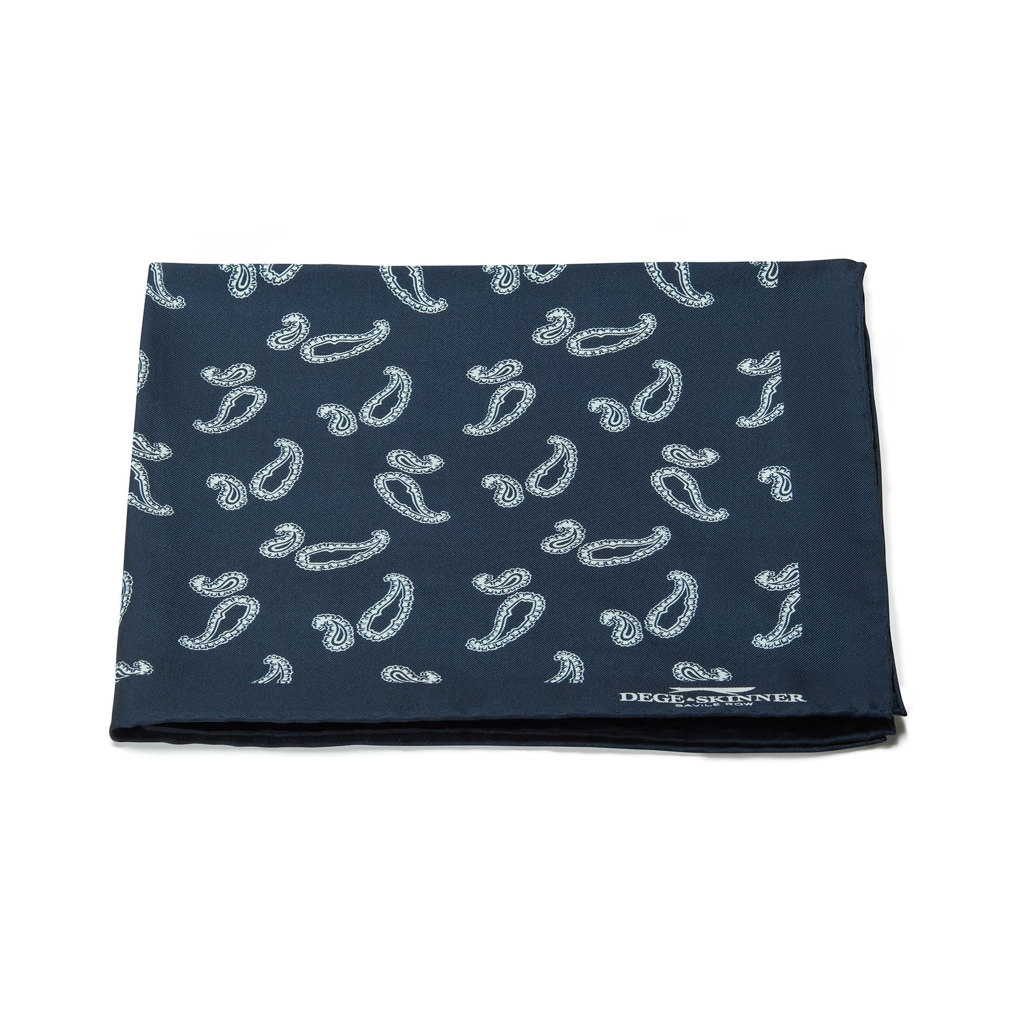 Pure silk pocket square in navy blue paisley, with hand-rolled edging.