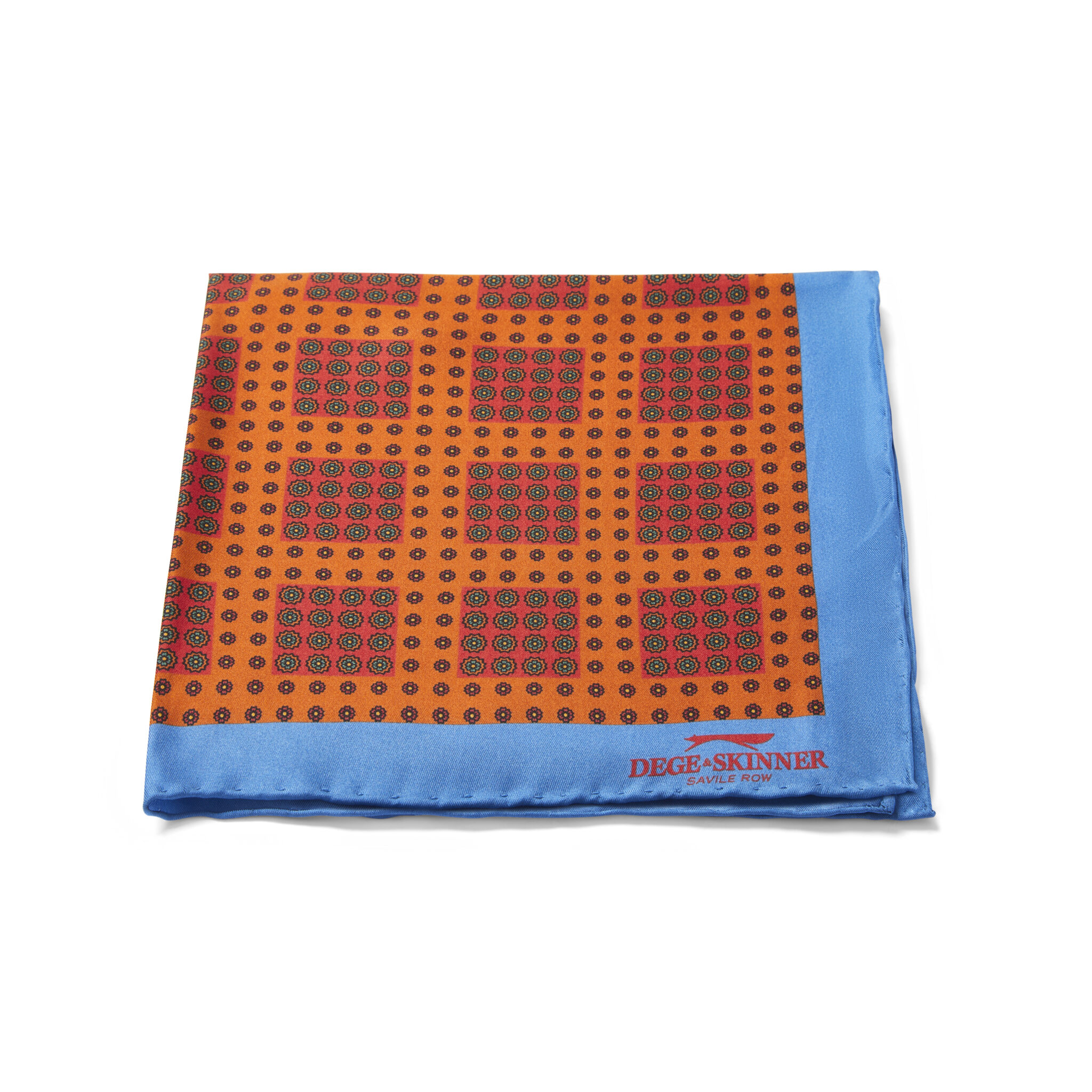 Silk Pocket Square, Royal Blue With Rust/Red/Green Motif