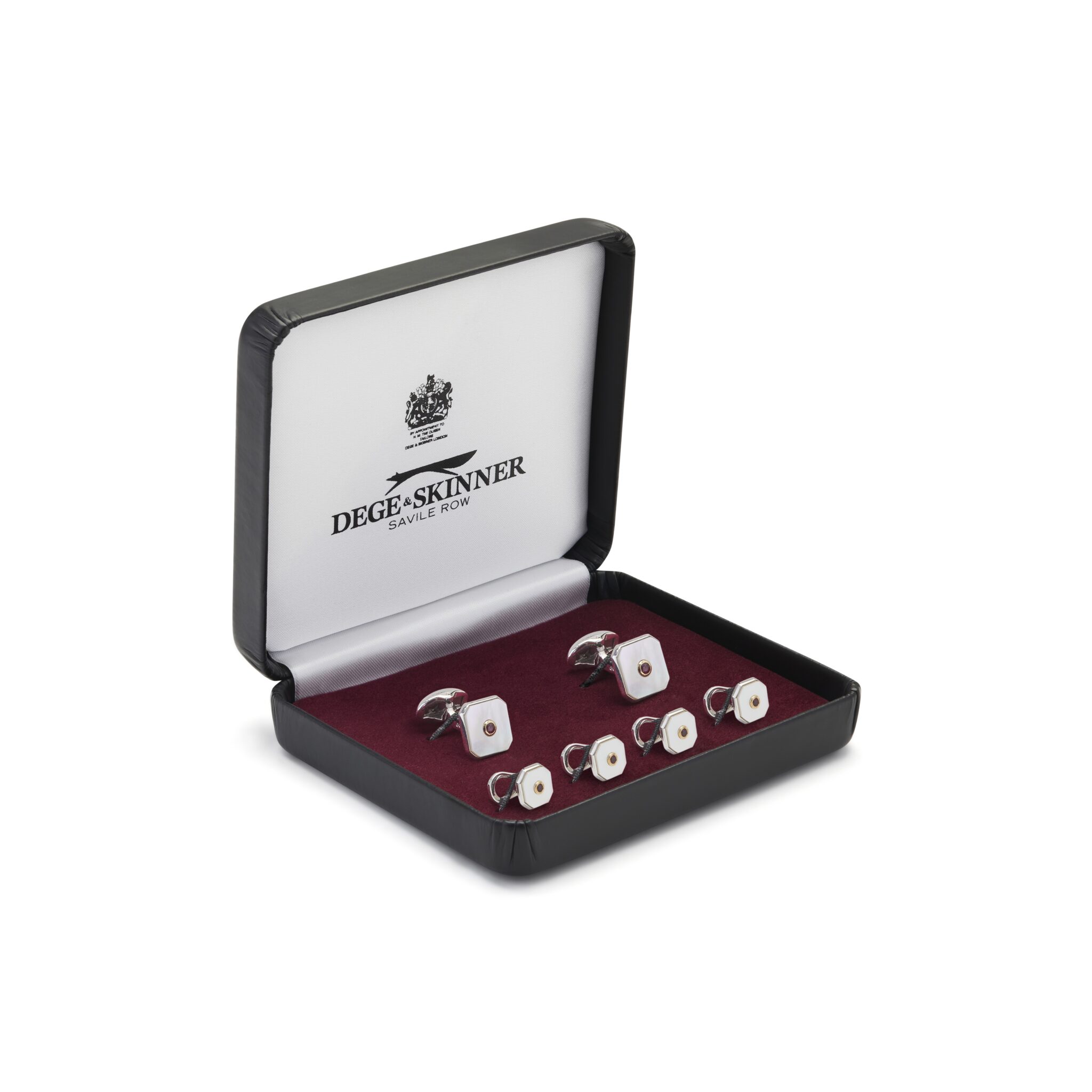 Sterling silver & rhodium plated cufflink and dress stud set, inlaid with pure mother of pearl & red ruby centres. Perfect for black tie and evening attire.