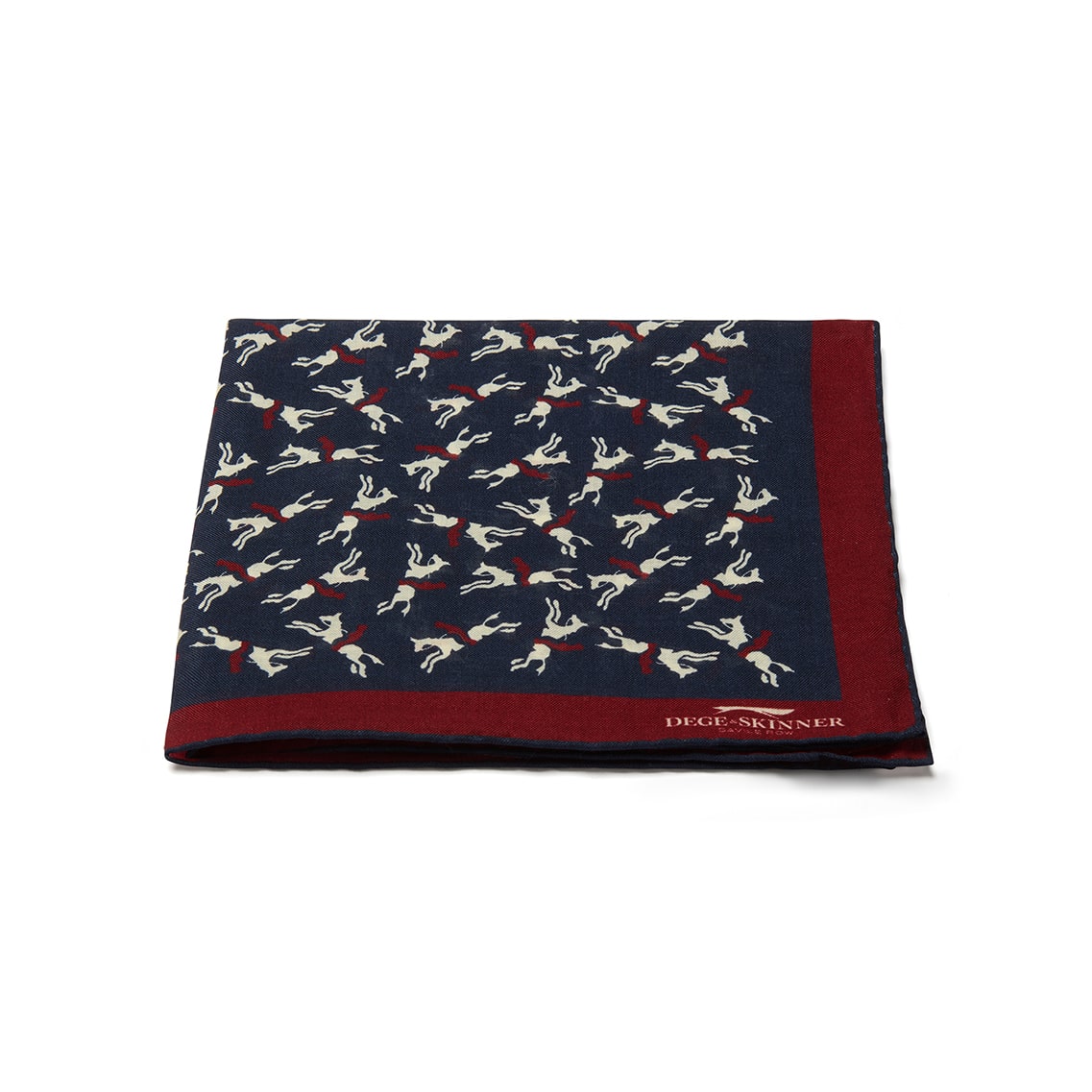 Wool and silk pocket square with horse racing motif in red, white and navy blue.