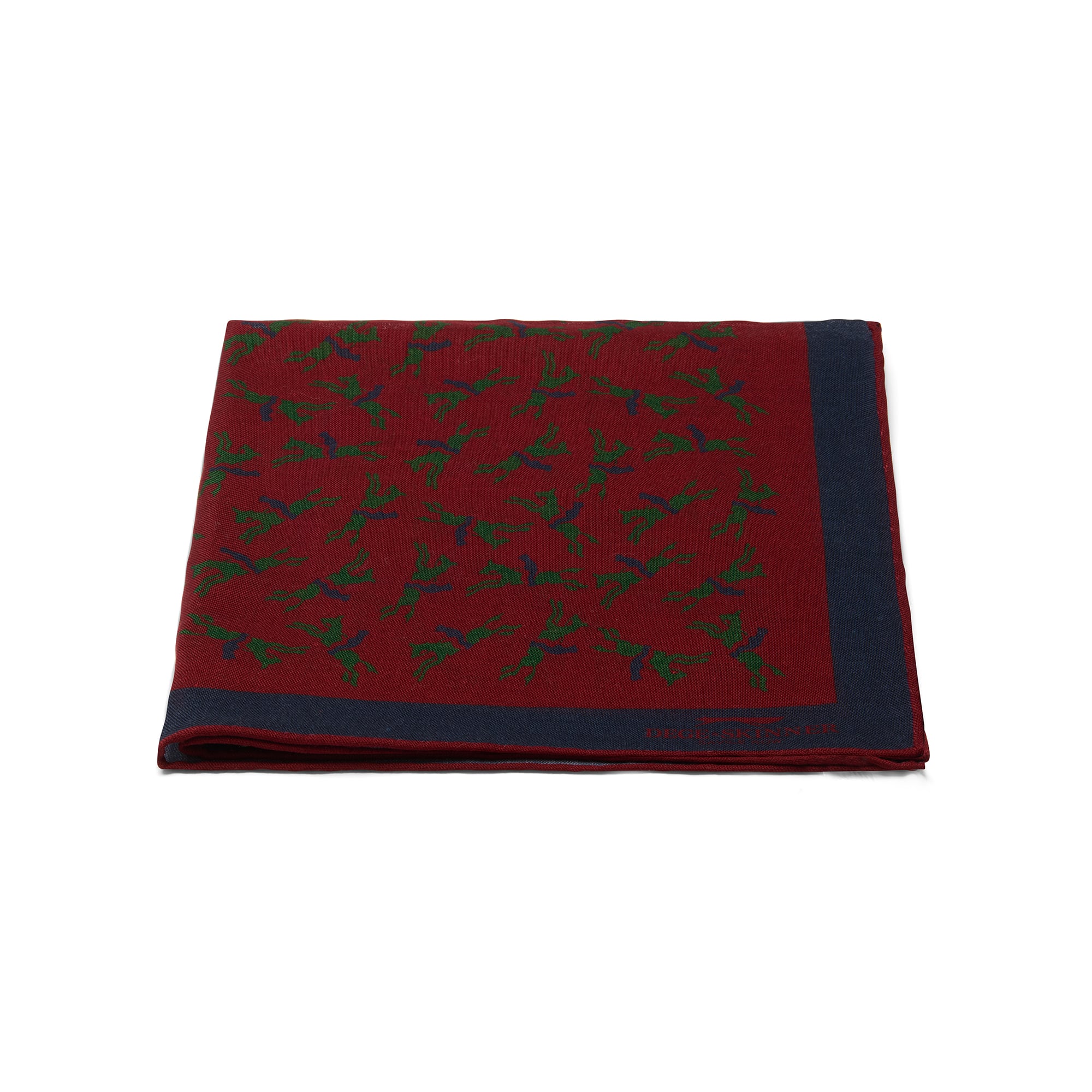 Wool and silk pocket square with horse racing motif in red, blue and green.