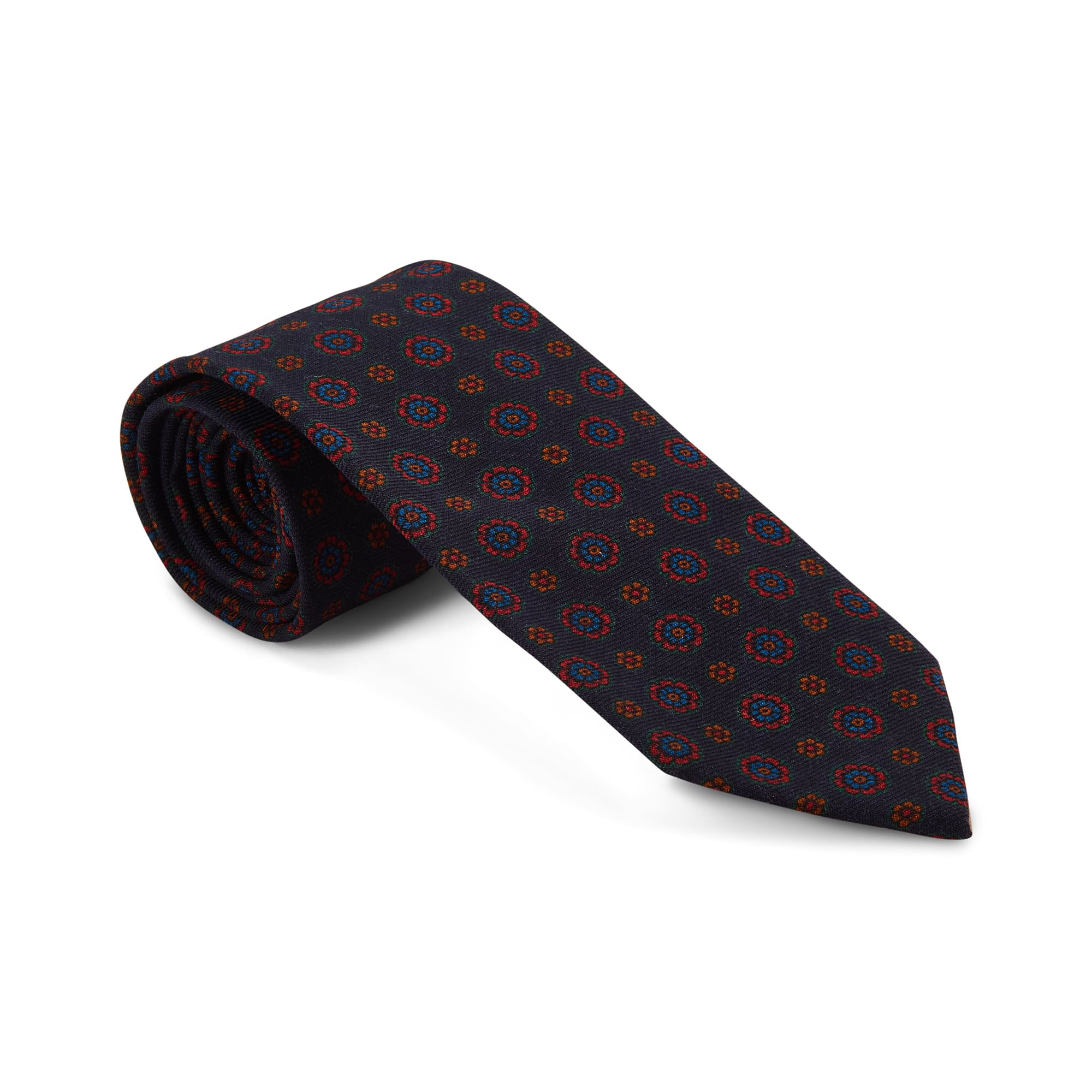 Navy, Royal Blue & Scarlet Flower Medallions Woollen Tie