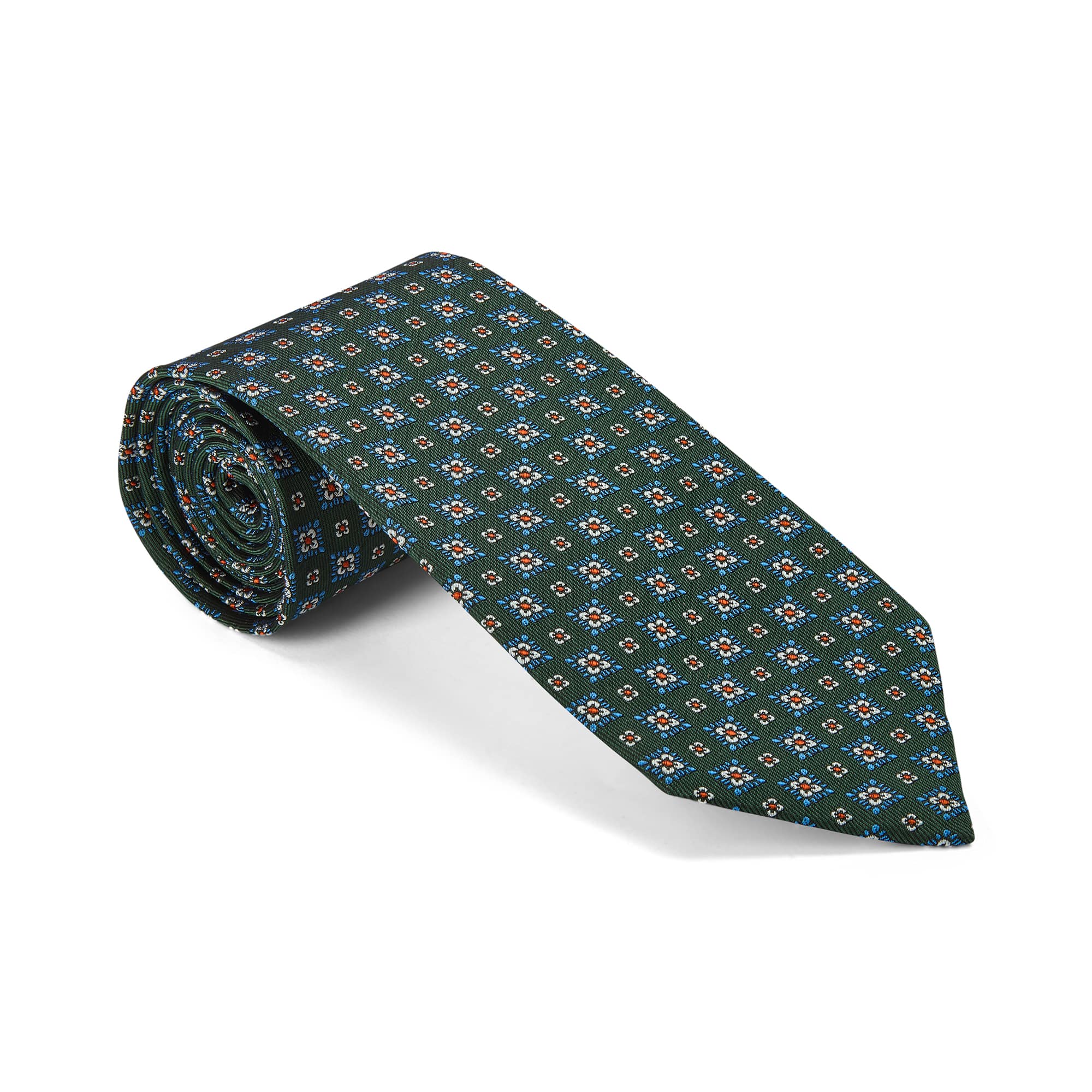 Dark green woven silk tie with azure blue small flowers motif.